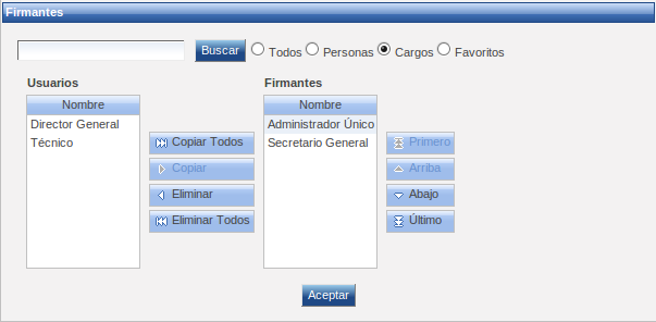 | • | Pulsando sobre el enlace Para o el icono de usuario, se mostrará una pantalla de selección de firmantes, desde la que se podrán elegir los destinatarios de la petición así como el orden de firma. Dicha pantalla ofrece la posibilidad de filtrar la búsqueda por nombre, apellidos, DNI o nombre del puesto de trabajo. Además permite filtrar también por puestos de trabajo o personas. Para añadir firmantes basta con seleccionarlo y pulsar sobre los botones copiar para que se añadan a la caja de firmantes. Los firmantes seleccionados pueden ordenarse para establecer la jerarquía de firma. |